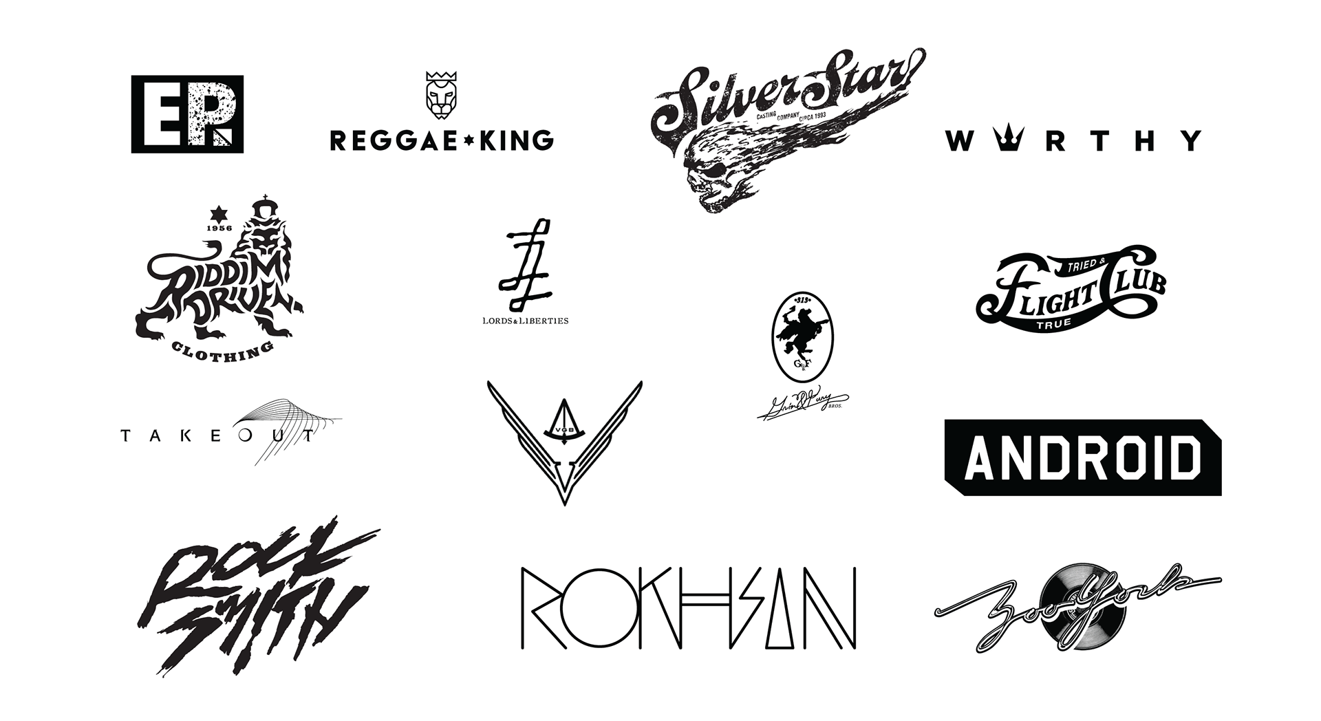 Branding work for various companies ranging from apparel, web and music entities. Android Homme 2013 Box Logo, Reggaeking.com logo and wordmark, Rocksmith NY Daft Rock wordmark, VGB/Karmaloop Wing logo.